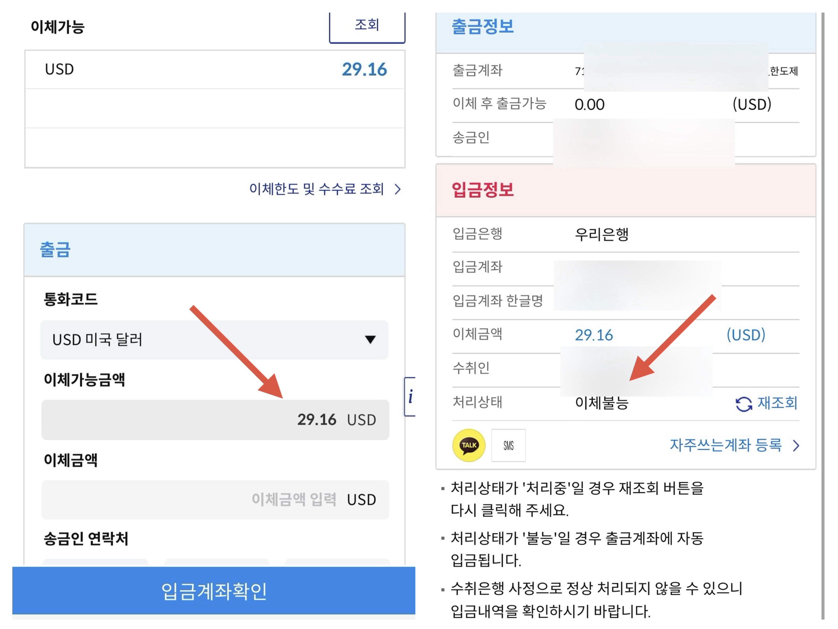 – 삼성: 투자금 받은날로부터 영업일기준 6일후 출금가능 / 외화이체 메뉴 → 계좌 선택 → 환전 처리 → 원화계좌 반영